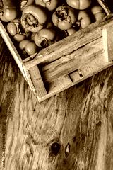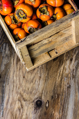 Box of fresh fruits persimmon kaki on wooden background. Copy space