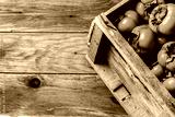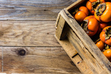 Box of fresh fruits persimmon kaki on wooden background. Copy space