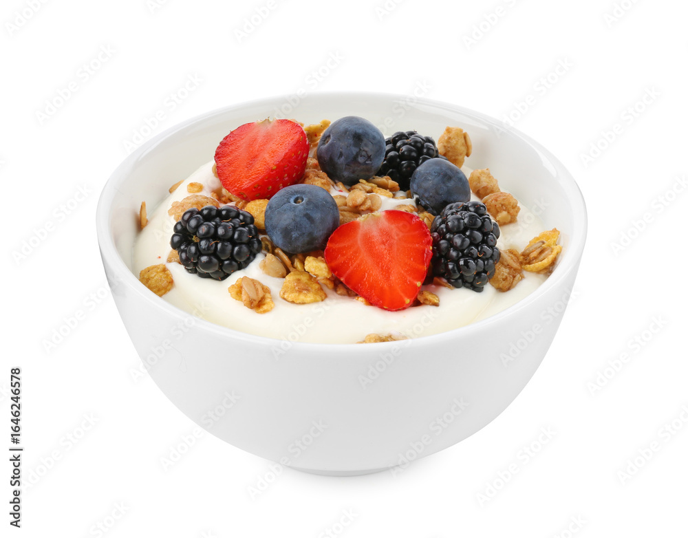 Tasty yogurt with granola and berries in bowl isolated on white
