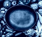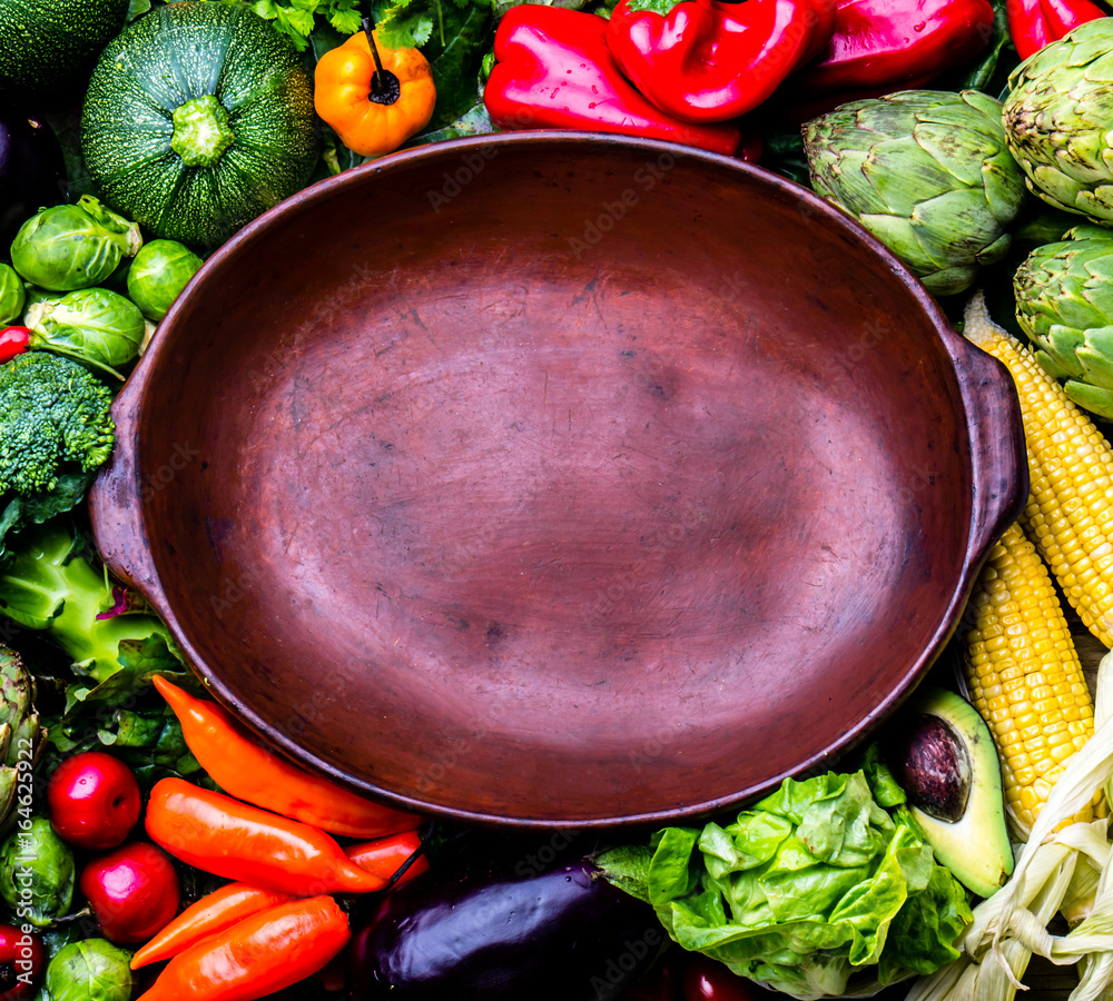 Cooking background concept. Fresh organic vegetables around empty clay pot