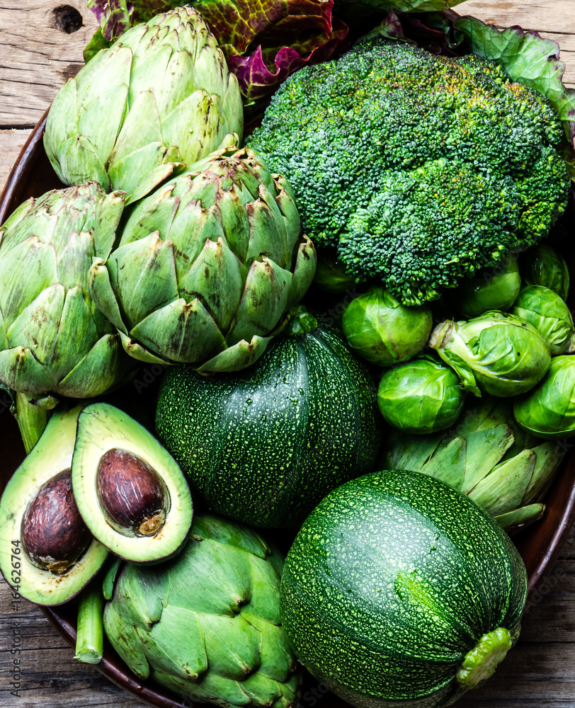 Cooking background harvest concept. Fresh organic green vegetables in clay pot.