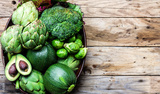 Cooking background harvest concept. Fresh organic green vegetables in clay pot.