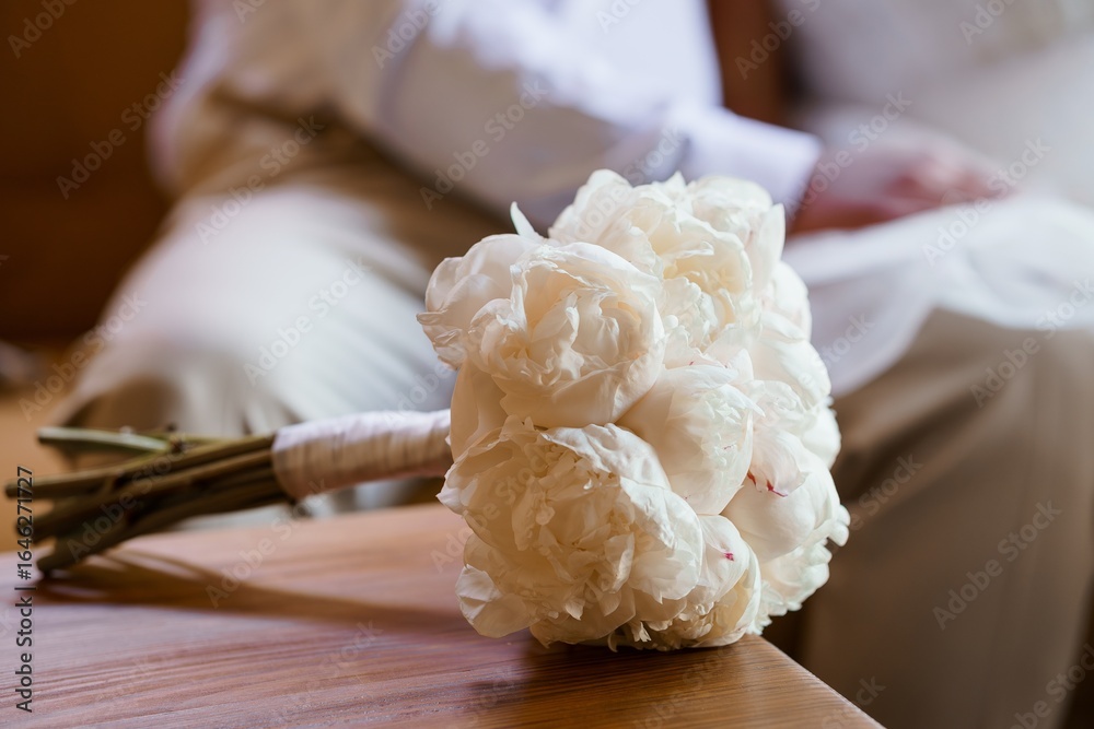 Elegant White Peony Wedding Bouquet on Wood Table, Bridal Flowers, Soft Focus, Romantic Ceremony, Natural Light, Cream Colors, Floral Arrangement