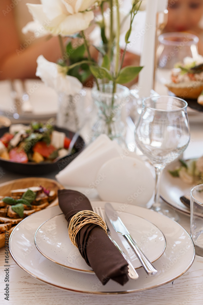 Elegant Wedding Table Setting with White Lillies and Brown Napkins. Formal Dining Scene. Luxury Celebration. Close-up Shot. Soft Lighting