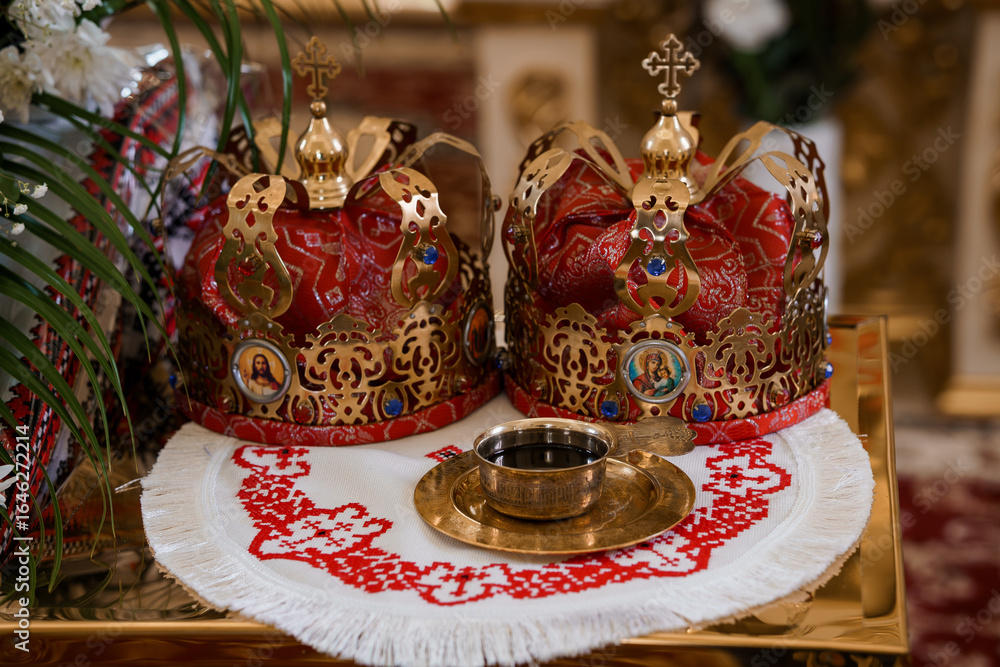 Solemn Eastern Orthodox Wedding Crowns Ceremony with Red Textiles and Gold Icons in Church Interior