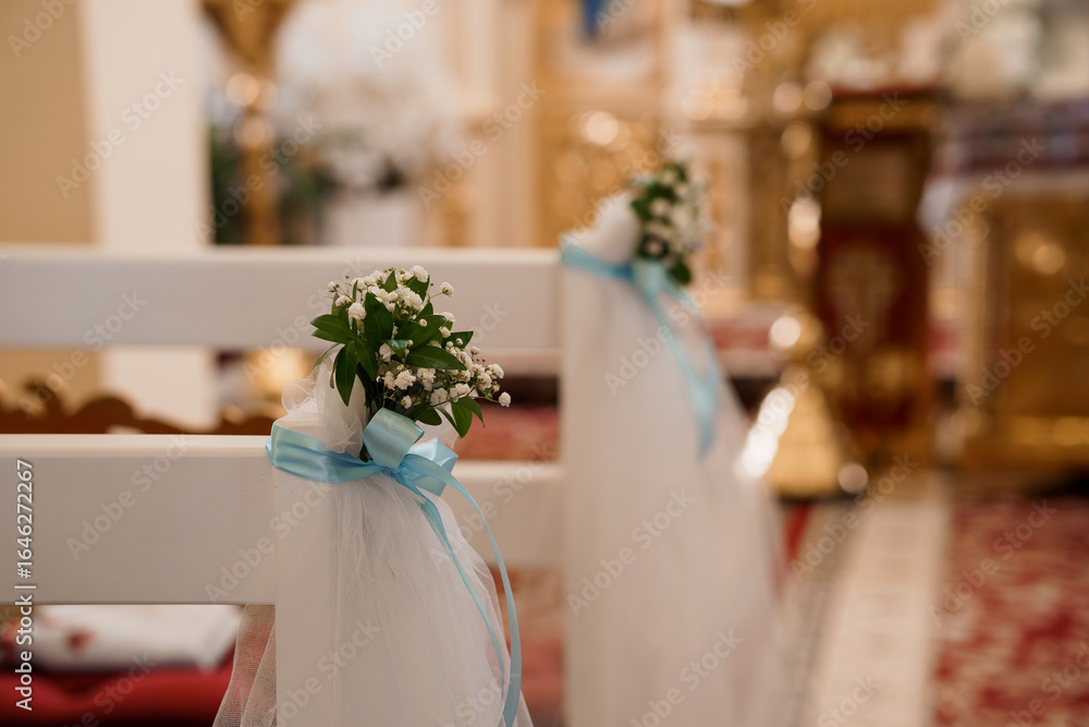 Elegant Wedding Ceremony Pew Decorations with Blue Ribbon and Baby's Breath in Church Setting
