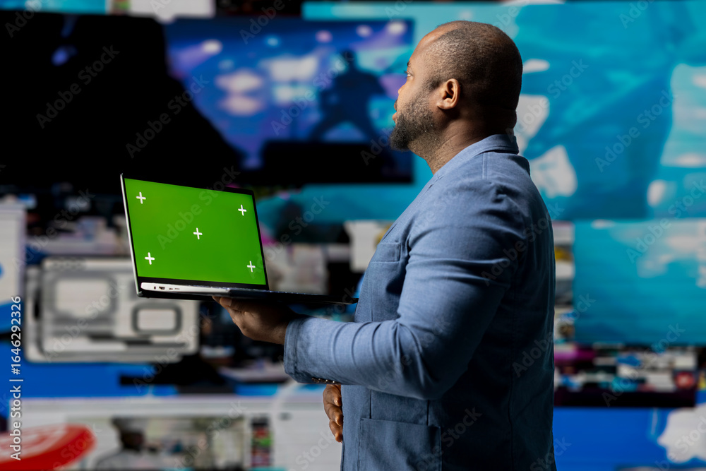 Modern black interface user holding a device with green screen with digital system of screens and apps, highlighting the integration of AI and fintech. Communication and content creation.