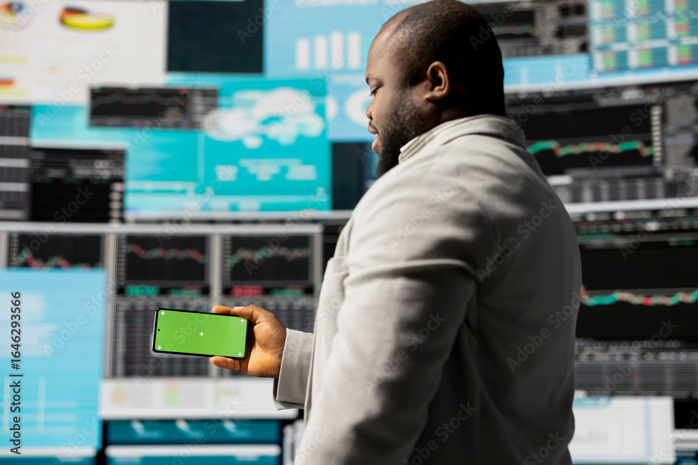 African american administrator uses copy space on phone and examines dashboards, ensuring analytics and performance metrics with KPI projections. Management decision for innovation.