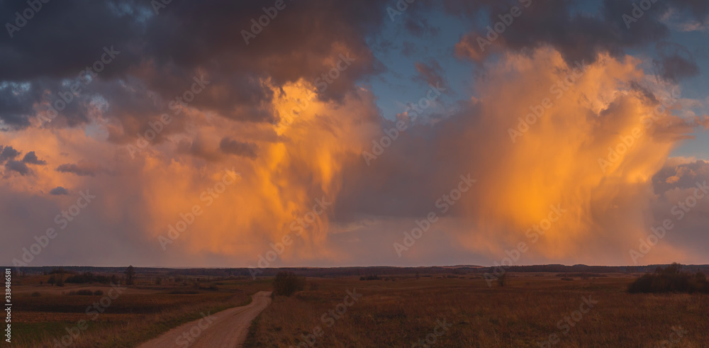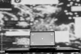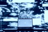 Surrounded by data and neural networks systems, laptop in empty space shows copy space screen for artificial intelligence automation and development. High tech data visualization.