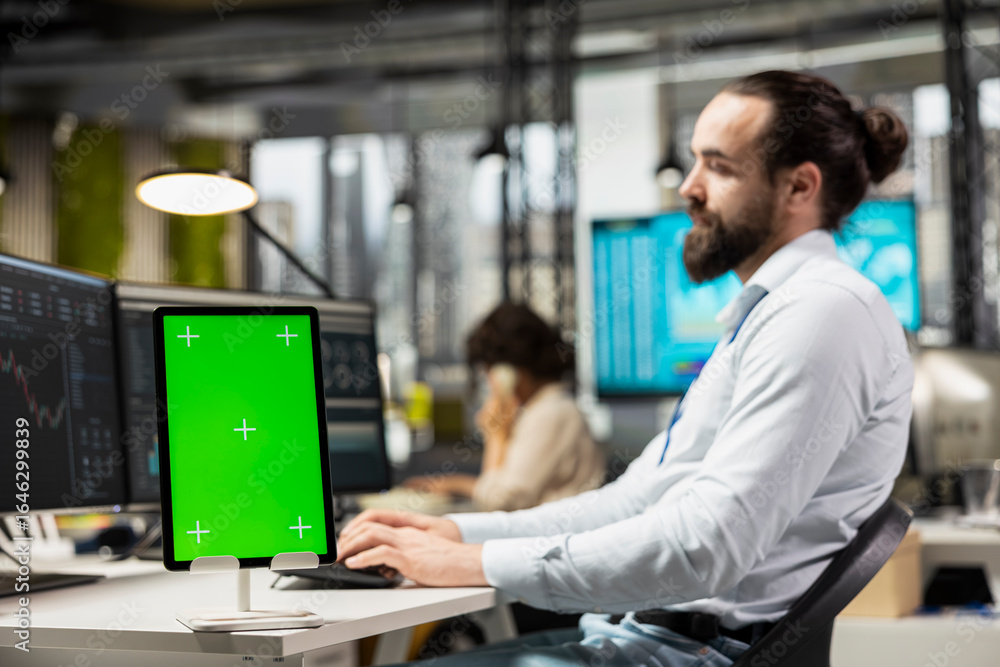 Finance analyst working on stock trade progress with green screen, using graphs and trends to monitor the capital from the business account. Young man ensuring development.