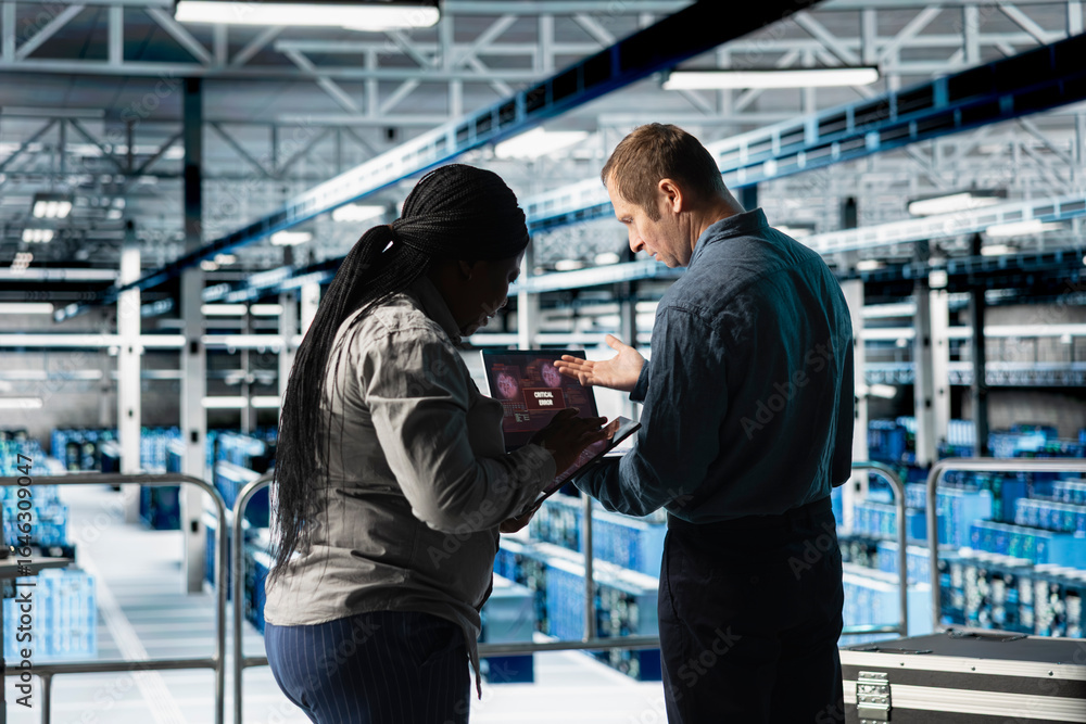 Team of data center technicians analyzing security breaches in firewall, trying to remove malware. Server farm coworkers doing brainstorming, removing virus spreading across hardware rigs