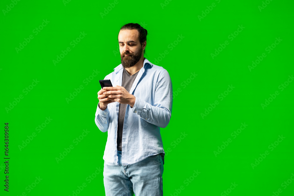 Casual stylish guy browsing his smartphone against green screen background, connected online on social network platforms or texting messages. Young adult focused on social media apps.