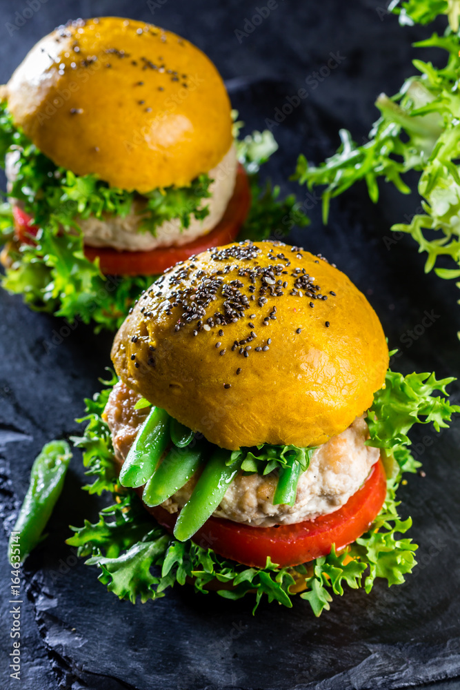 Colored yellow burgers. Chicken burgers hamburgers with turmeric bread