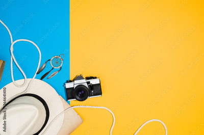 Travel accessories top view on colorful background with copy space. Lay flat woman traveler products on blue and yellow seamless