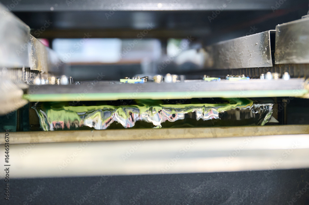 Wave soldering process showing PCB tinning in molten solder bath during manufacturing