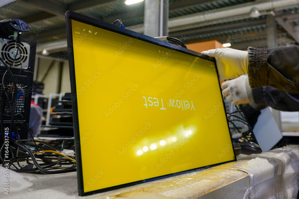 Monitor screen testing process inside an electronics manufacturing plant with quality assurance checks in action