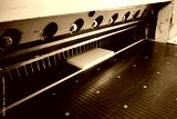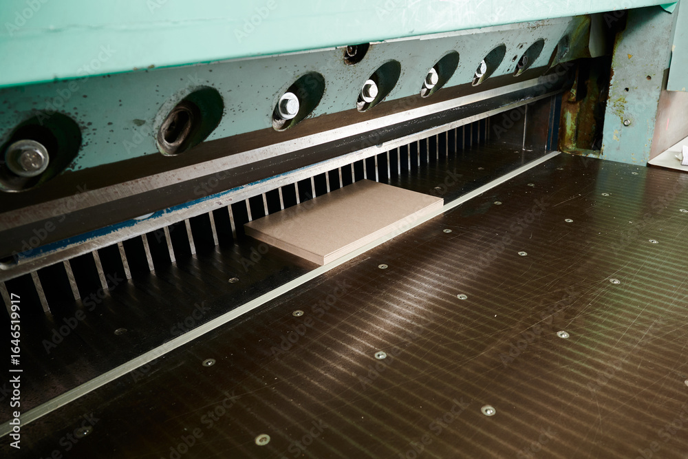 Precision cutting of cardboard sheets on guillotine shears in a bustling workshop environment