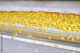 Pasta travels along the conveyor belt in a bustling factory setting during the vibrant hours of production