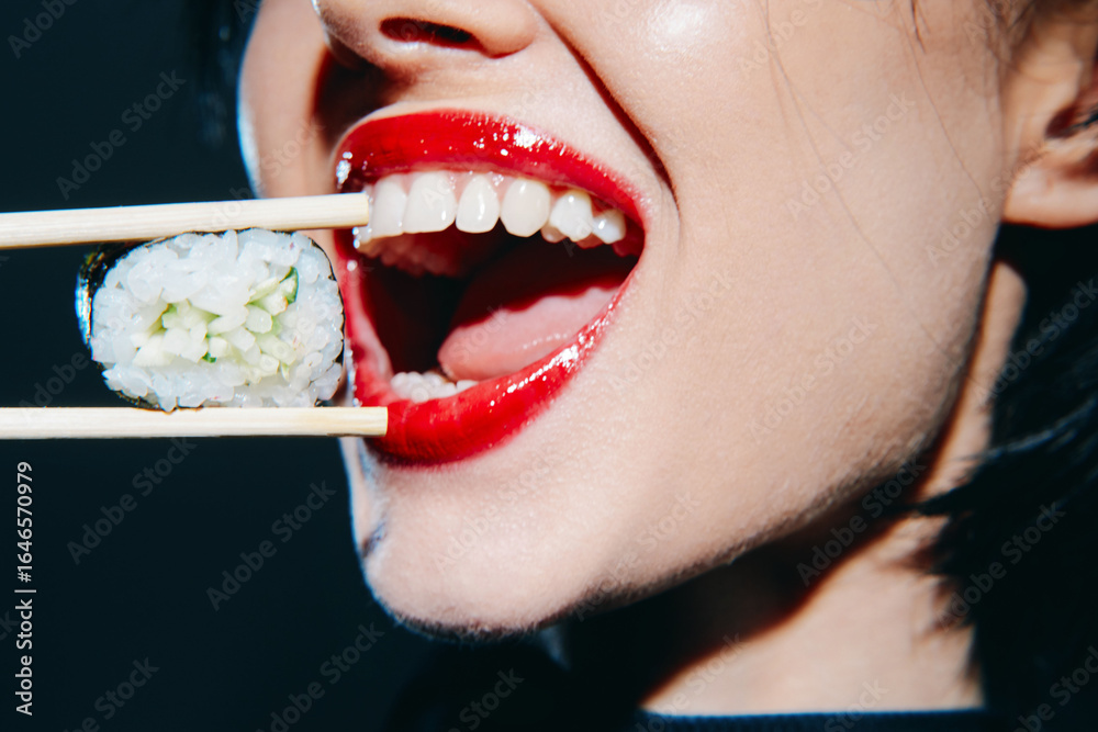 Close-up of a woman with bold red lipstick joyfully holding sushi with chopsticks, showcasing an expression of delight against a dark backdrop.