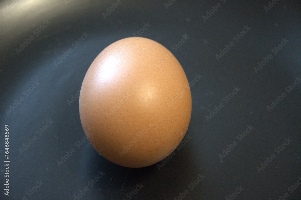 One fresh brown chicken egg placed on a black plate, photographed in close-up with copy space for text or design. Minimal and simple food concept.
