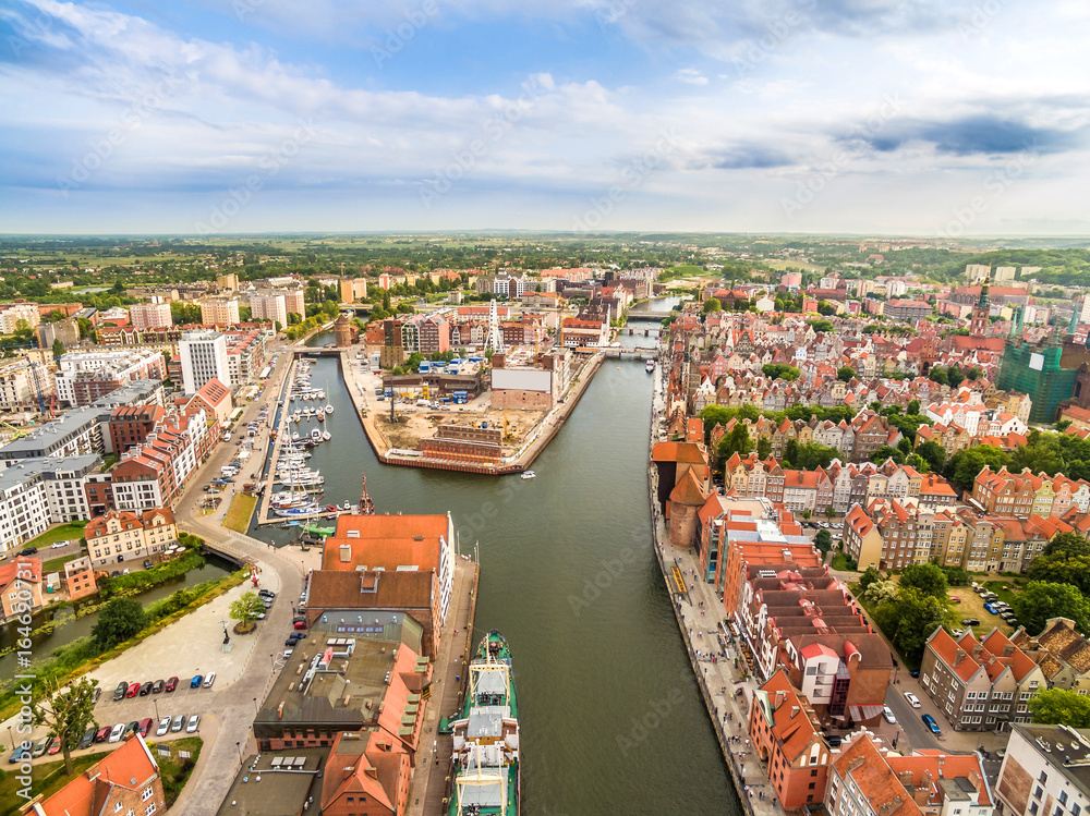 Gdańsk - stare miasto z lotu ptaka. Krajobraz Gdańska ze starą Motławą i wyspą Spichrzów.