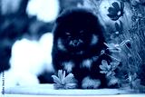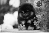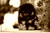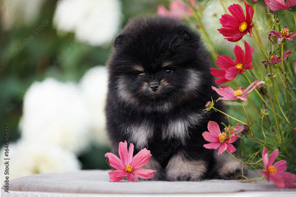 black and tan pomeranian spitz puppy posing with red flowers outdoors