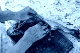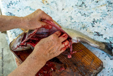 A close-up photograph shows a older person hands descale a freshly caught fish on a wooden cutting board with background features a rustic, weathered surface with a floral pattern.