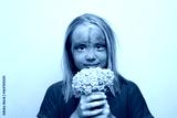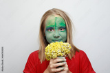 Pretty young girl child with green face paint makeup. Halloween ogre look