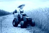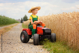 Małe dziecko, chłopiec w wieku 6 lat, w roboczym kombinezonie, słomkowym kapeluszu, siedzi na traktorze obok pola dojrzałego zboża.