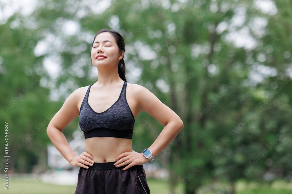 Young asian sportswoman breathing fresh air in public park