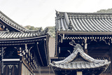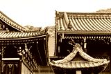 Japanese temple rooflines at Kiyomizu-dera in Kyoto with vintage color grading and low contrast, highlighting detailed eaves, curved tiles, and woodwork craftsmanship