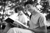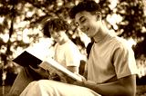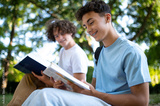 Two teens in the park preparing for the lessons and reading a book