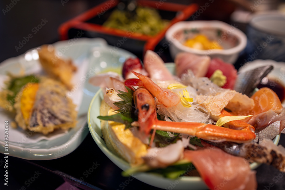 Traditional Japanese kaiseki dinner with assorted sashimi, tempura, vegetables, tofu, dipping sauces, and garnishes