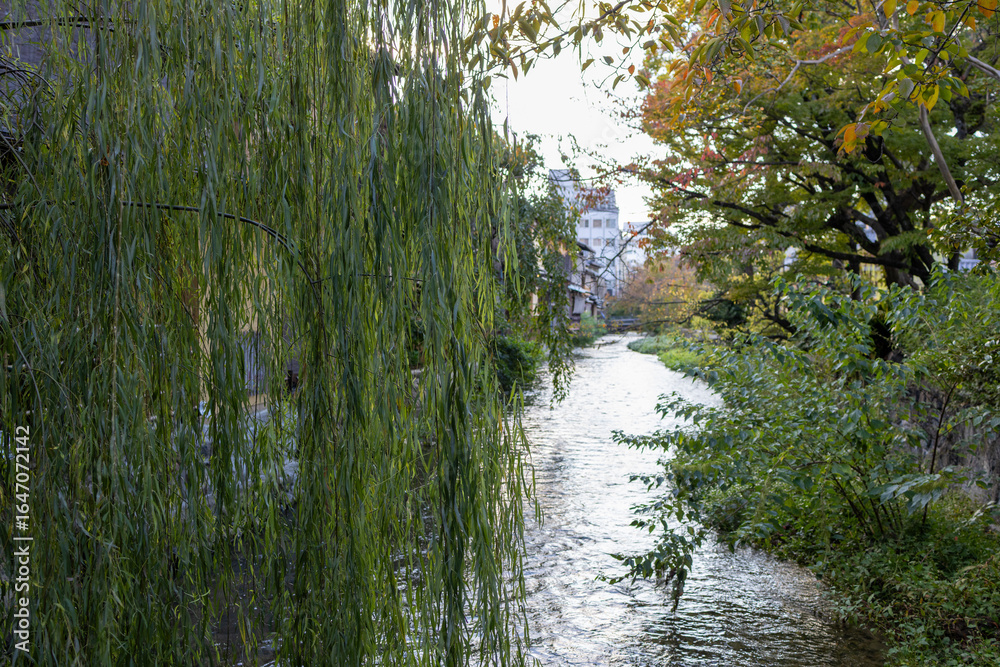 Evening view of a canal in Kyoto, Japan surrounded by willow branches, autumn trees, and greenery along the waterway with city buildings in the distance