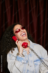 Portrait of young adult Black woman laughing with joyful expression while holding retro corded phone in photo booth, wearing sunglasses and large bracelets