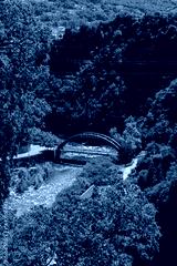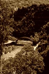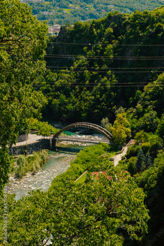 Arch bridge over river surrounded by dense green hills with partial view of Sondrio city in the background