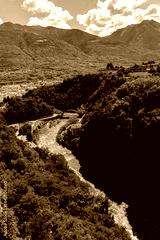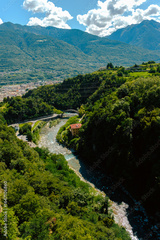 Aerial view of river with stone bridge, yellow building, and surrounding green hills leading to the city of Sondrio, Italy