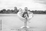 Uśmiechnięty chłopiec w okularach przeciwsłonecznych, siedzi w białym fotelu na plaży, trzyma w ręku megafon, jest pewny siebie i zadowolony.