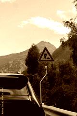 Close-up of road construction warning sign with red light beside car on mountain road surrounded by trees and hills