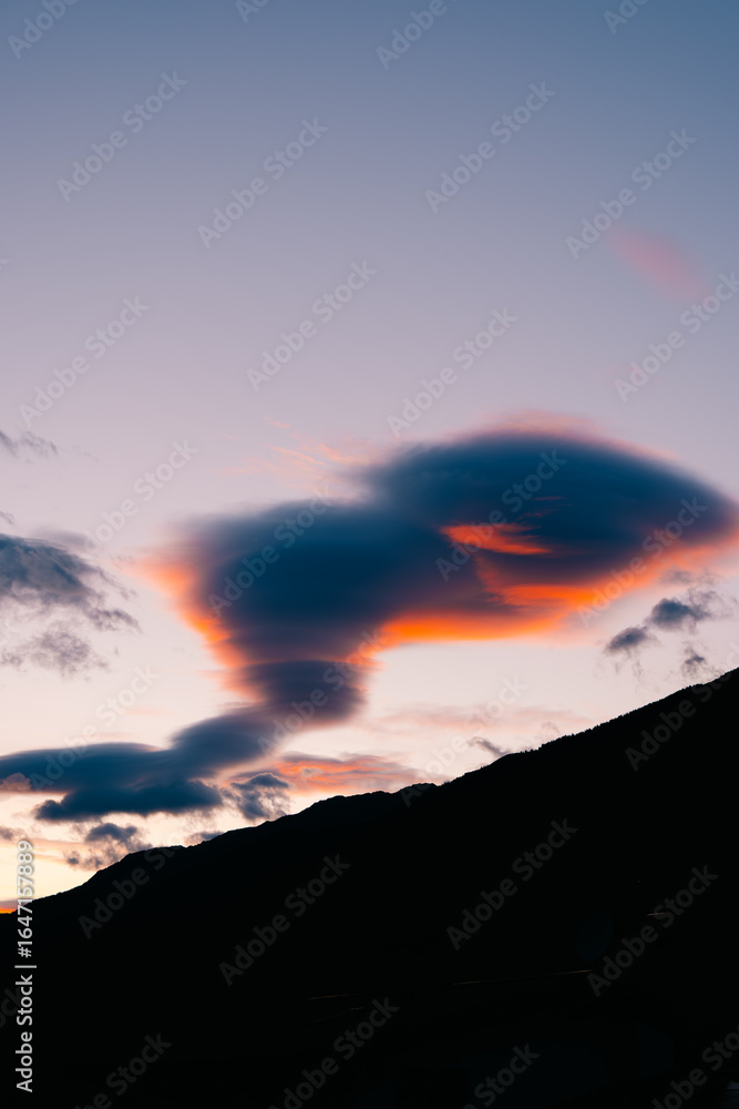 Pastel pink lenticular clouds drifting over mountain silhouette in serene evening sky