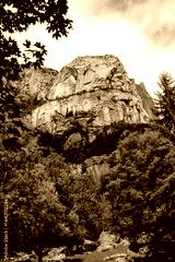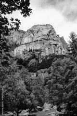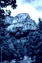 Steep rocky mountain face framed by lush green forest under bright summer sky
