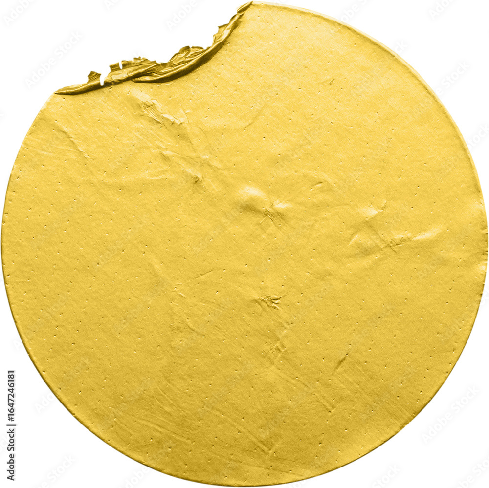 Blank golden round adhesive paper metallic sticker label isolated on white background