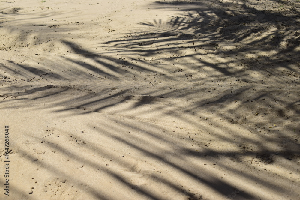 Sombra tropical sobre areia branca em dia de sol. Sombra da palha de coqueiros em férias no litoral do nordeste brasileiro, sombreado em praia do Brasil