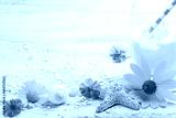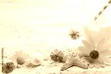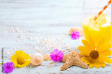 Sommer Cocktail am Strand mit Blumen und Muscheln