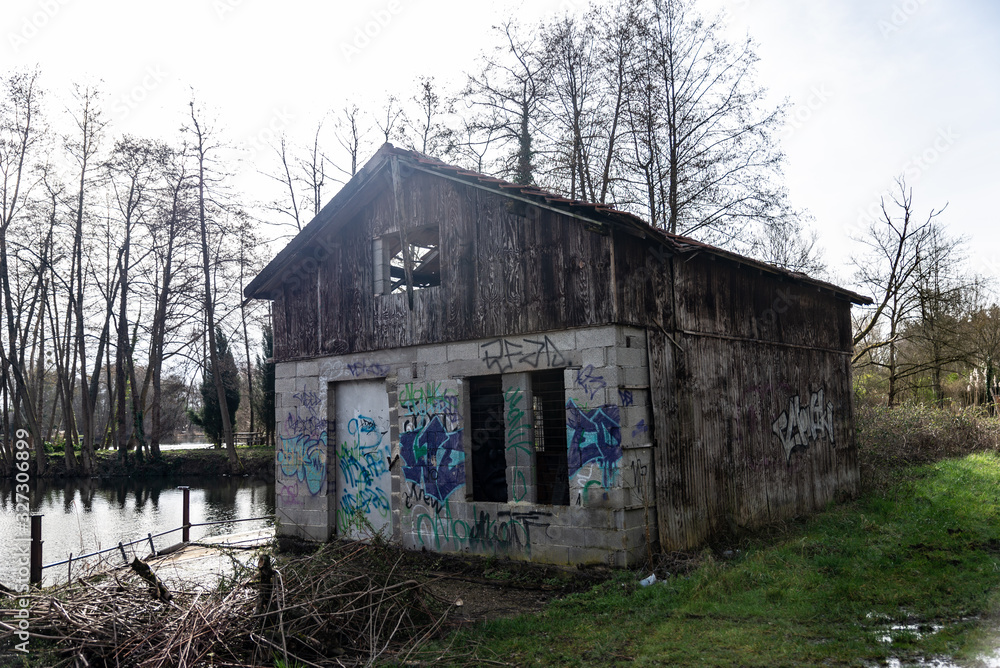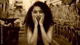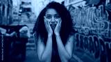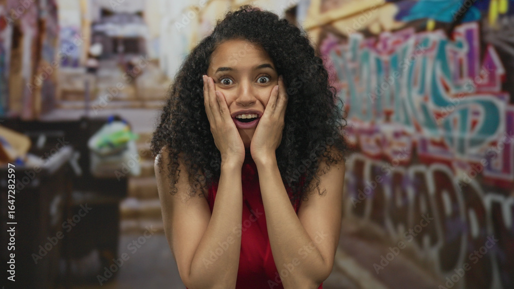 Woman expressing surprise in an urban street with colorful graffiti background, showcasing outdoor art and youthful energy in a vibrant city setting.