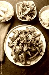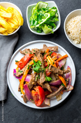 Peruvian dish Lomo saltado - beef tenderloin with purple onion, yellow chili, tomatoes served on white plate, slate background