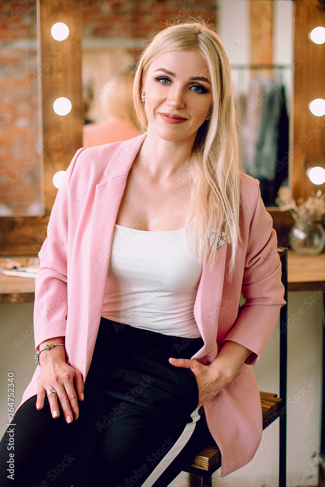 Make-up artist positive beautiful blonde woman posing near mirror in make-up room