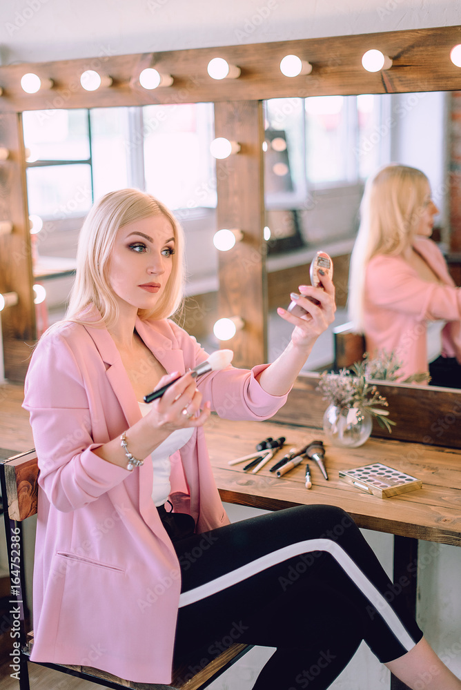 Portrait of a beautiful blonde woman applying makeup near a mirror