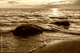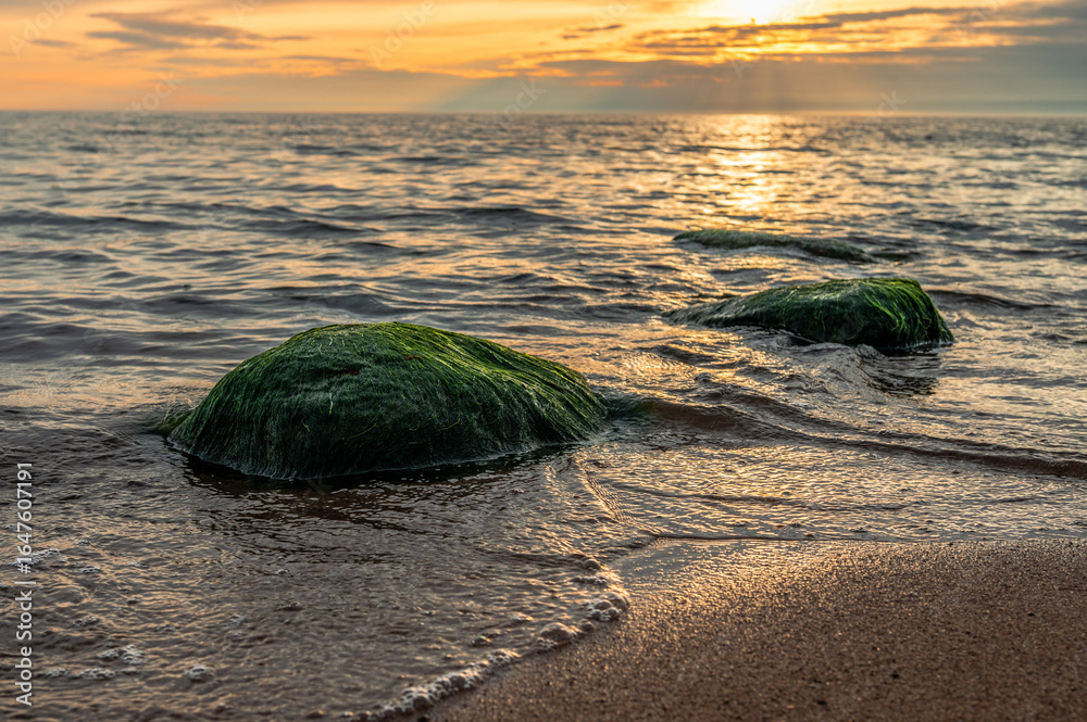 Seaweed-covered boulders sit in the gentle waves of the sea, illuminated by the setting sun.