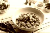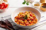 Fusilli macaroni with fresh cherry tomatoes and tomato sauce topped with parmesan cheese and chopped parsley leaves in a plate.